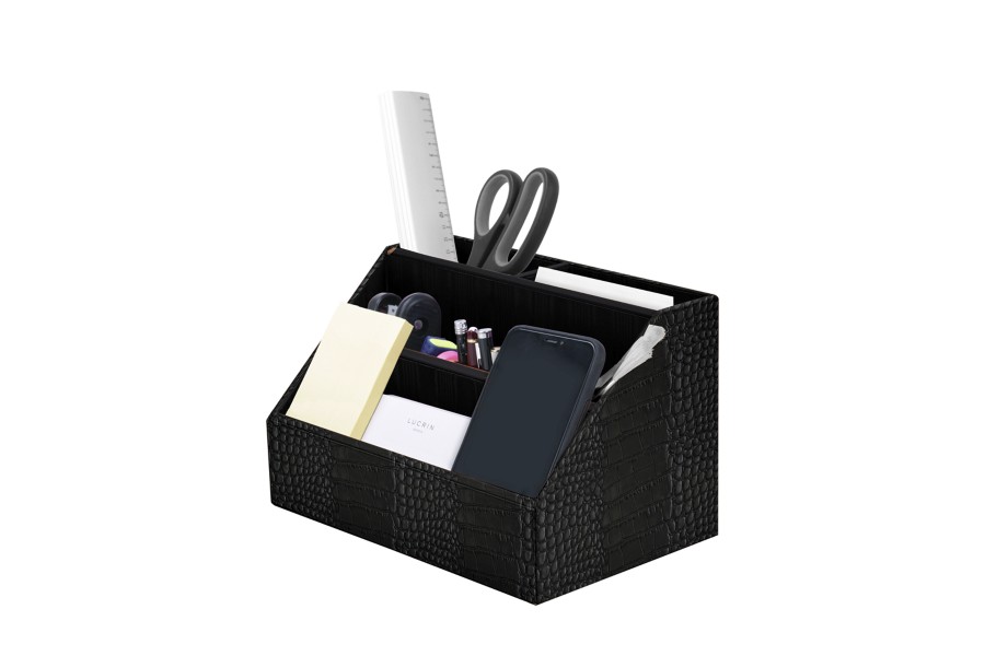 Voor een verzorgde werkruimte, presenteert Lucrin deze prachtige bureau organizer uit echt leer. Hij bestaat uit een houten structuur die deskundig bekleed is met het allerbeste volnerf leer, voor perfecte stabiliteit op uw bureaublad. Hoewel hij door zijn elegante look vaak gebruikt wordt als kantoordecoratie, is de primaire functie van dit artikel om opbergruimte (5 compartimenten) te bieden voor uw bureauaccessoires zoals nietjesmachine, liniaal, post-its, potloden, enveloppen, markeerstiften, enzovoort. Deze leren bureauhouder is dan ook een must-have voor een perfecte kantoororganisatie. U kan hem bovendien zelfs met uw initialen of uw naam personaliseren.