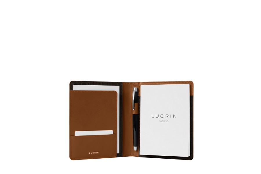 Dit kantooraccessoire is zeer populair onder professionals: de multifunctionele A6-schrijfmap. Deze leren schrijfmap van topkwaliteit is uitgerust met een gebogen plat insteekvak aan de linkerkant - met een vakje voor visitekaartjes - en een A6-notitieblok aan de rechterkant. Aan de rechterkant van de map bevindt zich bovendien een lus om uw favoriete pen in te bewaren. Met deze A6-schrijfmap houdt u alles wat u nodig heeft voor vergaderingen en zakenreizen altijd bij de hand. Opmerking: vervangende A6-notitieblokken zijn beschikbaar op onze website.