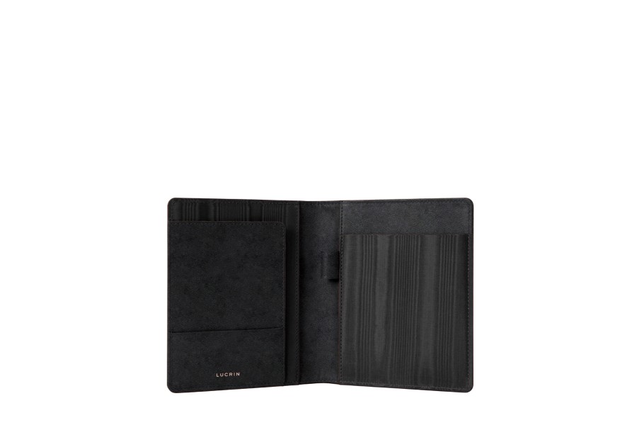 Dit kantooraccessoire is zeer populair onder professionals: de multifunctionele A6-schrijfmap. Deze leren schrijfmap van topkwaliteit is uitgerust met een gebogen plat insteekvak aan de linkerkant - met een vakje voor visitekaartjes - en een A6-notitieblok aan de rechterkant. Aan de rechterkant van de map bevindt zich bovendien een lus om uw favoriete pen in te bewaren. Met deze A6-schrijfmap houdt u alles wat u nodig heeft voor vergaderingen en zakenreizen altijd bij de hand. Opmerking: vervangende A6-notitieblokken zijn beschikbaar op onze website.