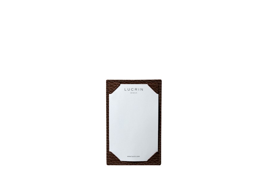Dit schrijfblok van compact formaat is ideaal voor het noteren van gedachten, notities, of telefoonnummers. Aan de ene kant heeft u het eenvoudige schrijfblok, waarbij de bladen worden vastgehouden door 4 ingeklipte hoeken. Aan de andere kant heeft u een gleuf waarin u wat papiertjes als navulling of een kaartje van standaard creditcardafmetingen kunt bewaren. Natuurlijk worden al onze schrijfblokken geleverd met witte LUCRIN bladen waarvan ook de navulling op deze website beschikbaar is.