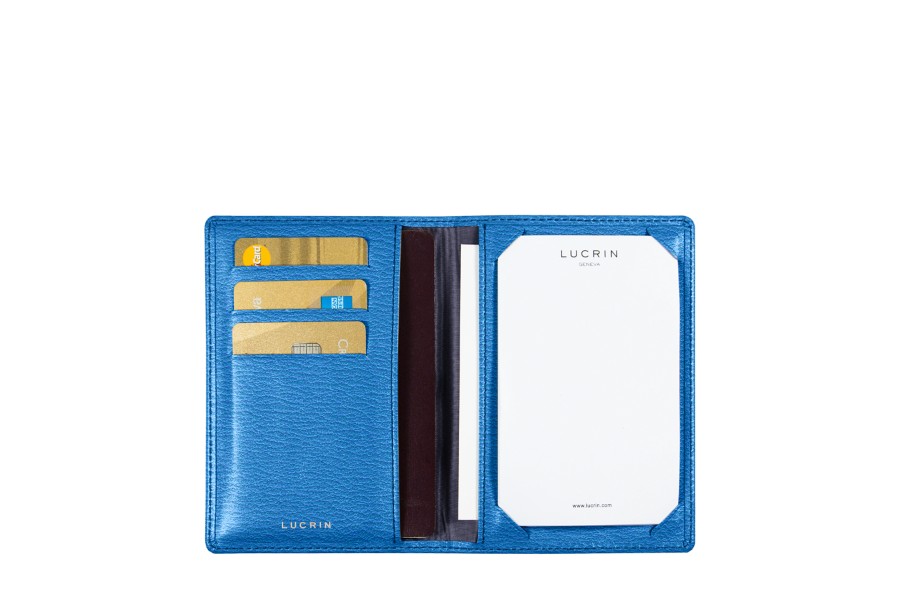 Zakformaat notitieblok van full grain leer. Met aan de linker binnenkant 2 vakjes, één voor visitekaartjes en één groot verticaal vak van paspoortformaat. Aan de rechterkant, het notitieblok en een groot verticaal vak. Geleverd met 10 witte pagina's. Afmetingen geopend: 19,5 x 14 cm. Afmetingen gesloten: 9,5 x 14 cm.