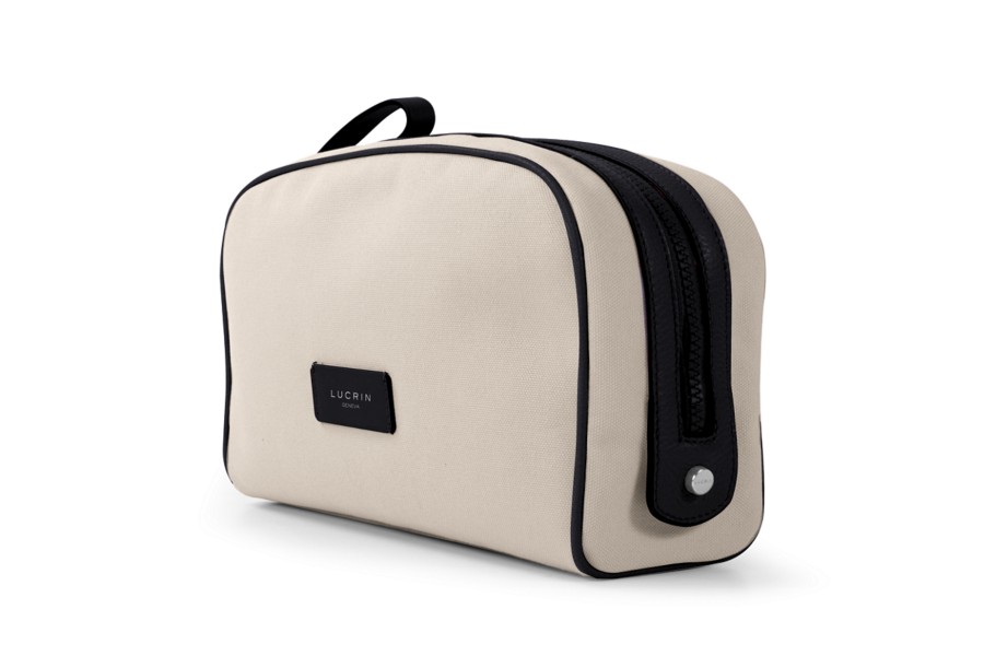 Lucrin Geneva’s exclusieve Designer Collectie stelt u graag voor aan de nieuwe canvas make-up tas met luxueuze leren afwerking. Hij is groot genoeg voor uw make-up en accessoires en heeft handige platte zakjes binnenin om extra spulletjes weg te stoppen. Deze make-up tas heeft een waterafstotend oppervlak, wat hem zelfs geschikt maakt voor buitenactiviteiten.